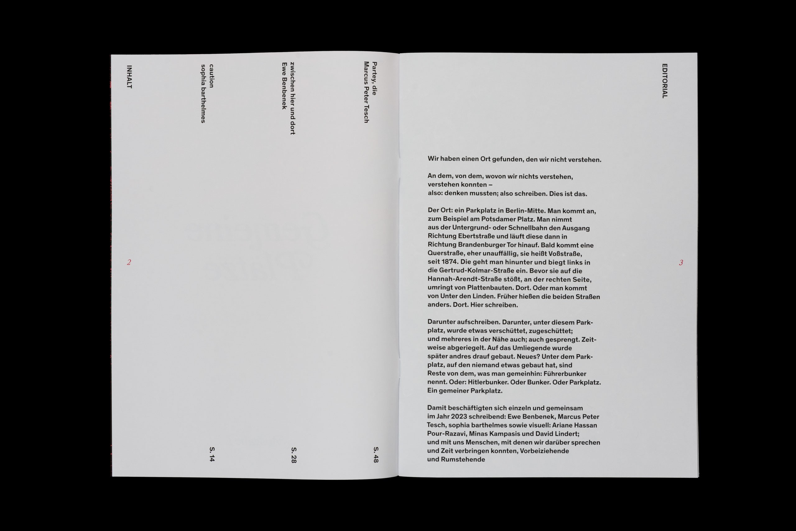 We designed the magazine in close exchange with the authors, translating their textual method into a precise editorial and typographic system. The layout strictly follows the internal logic of the text — its defined line breaks, deliberate gaps, and omissions. Rather than interpreting or smoothing the material, the design preserves the authors’ language as a spatial structure on the page.
